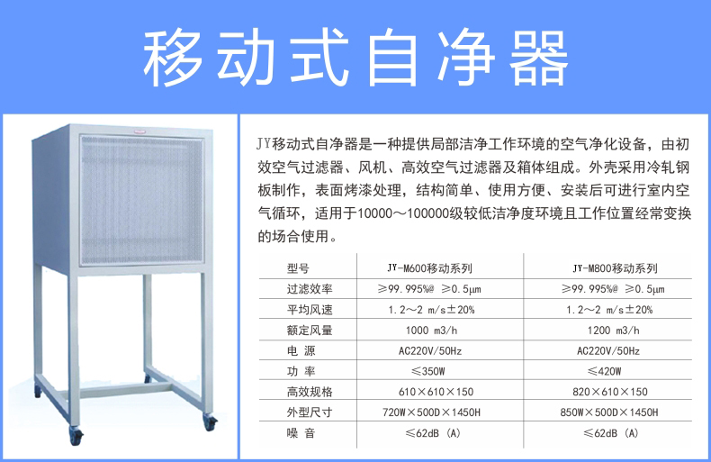JY移動式自凈器是一種提供局部潔凈工作環境的空氣凈化設備,由初效空氣過濾器、風機、高效空氣過濾器及箱體組成。外殼采用冷軋鋼板制作,表面烤漆處理,結構簡單、使用方便、安裝后可進行室內空氣循環,適用于10000~100000級較低潔凈度環境且工作位置經常變換的場合使用。